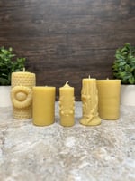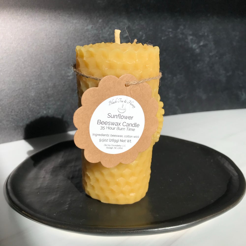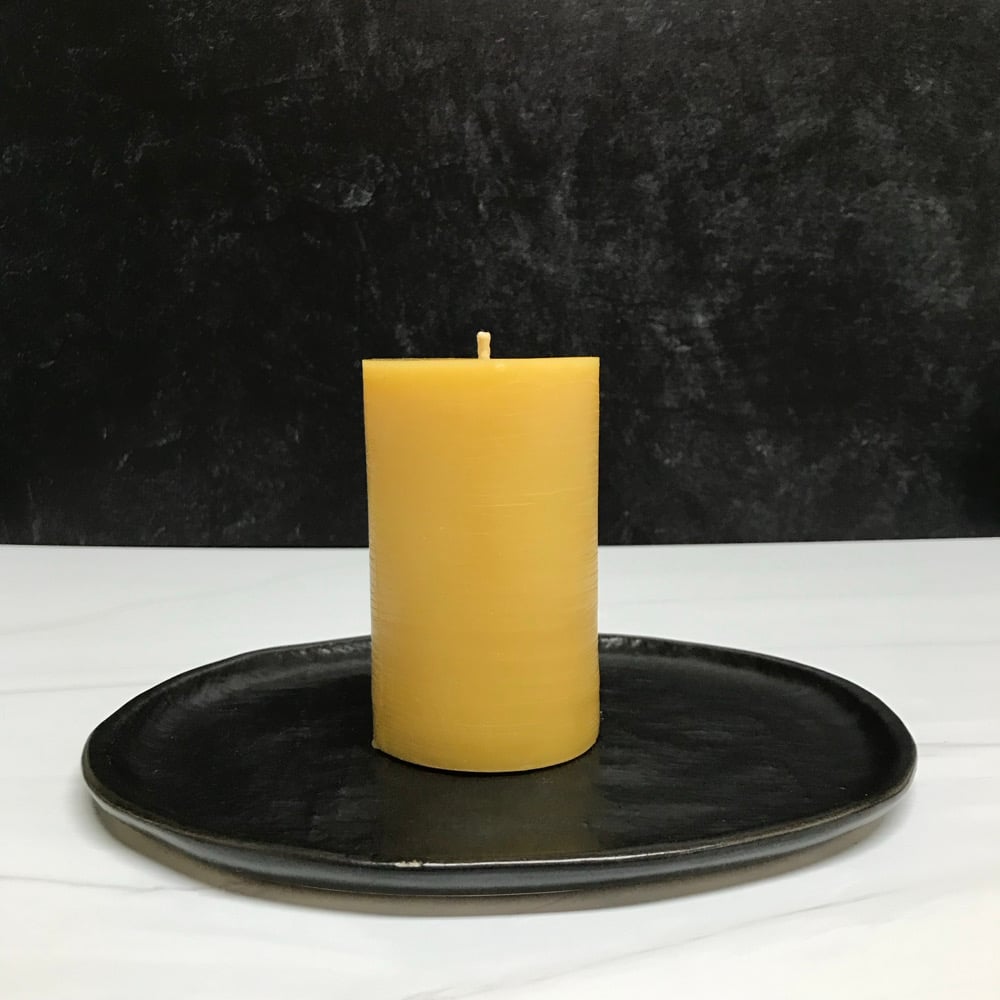 100% virgin, hand-poured beeswax candles. Pure beeswax has a light honey scent and warm yellow color. Note: this candle contains no fragrance oil so that you may enjoy it's natural scent and beauty.